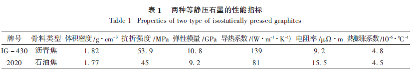 高溫氣冷堆非常安全這一特征,使人們提出了模塊化高溫氣冷堆的設(shè)計(jì)理念。下一代超高溫核反應(yīng)堆( UHTR),朝著高功率密度、高溫化方向邁進(jìn)。技術(shù)上的這些發(fā)展進(jìn)步,對(duì)新一代石墨材料的特性提出了更高的要求,比如,更高的輻照損傷耐受力,產(chǎn)品均質(zhì)化,物美價(jià)廉,長(zhǎng)期供貨等。美國(guó)在下一代核反應(yīng)堆( NGNP) 研發(fā)計(jì)劃中,把日本東洋炭素的IG - 430 和羅蘭石墨美國(guó)分公司的2020 兩種牌號(hào)的等靜壓石墨作為備選的堆芯材料進(jìn)行研究。這2種石墨的性能指標(biāo)見(jiàn)表1。